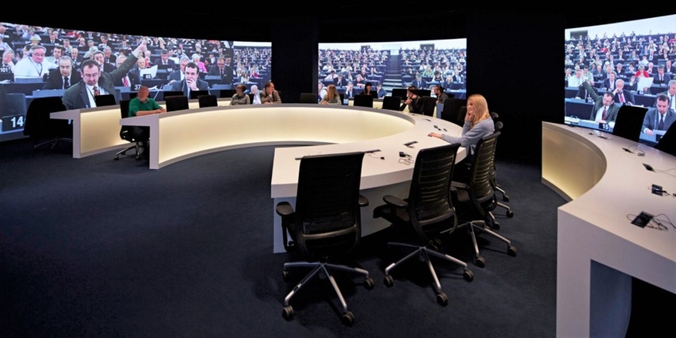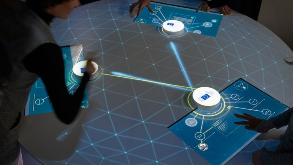 Telmaco delivered the interactive audiovisual backbone for Europa Experience at the European House Berlin: multi-touch media stations, round media tables, and a 360° cinema. An 11-channel edge-blended projection system with multilingual audio supports plenary simulations in all 24 EU languages, while remote monitoring from Athens ensures uninterrupted operation and content stability.
