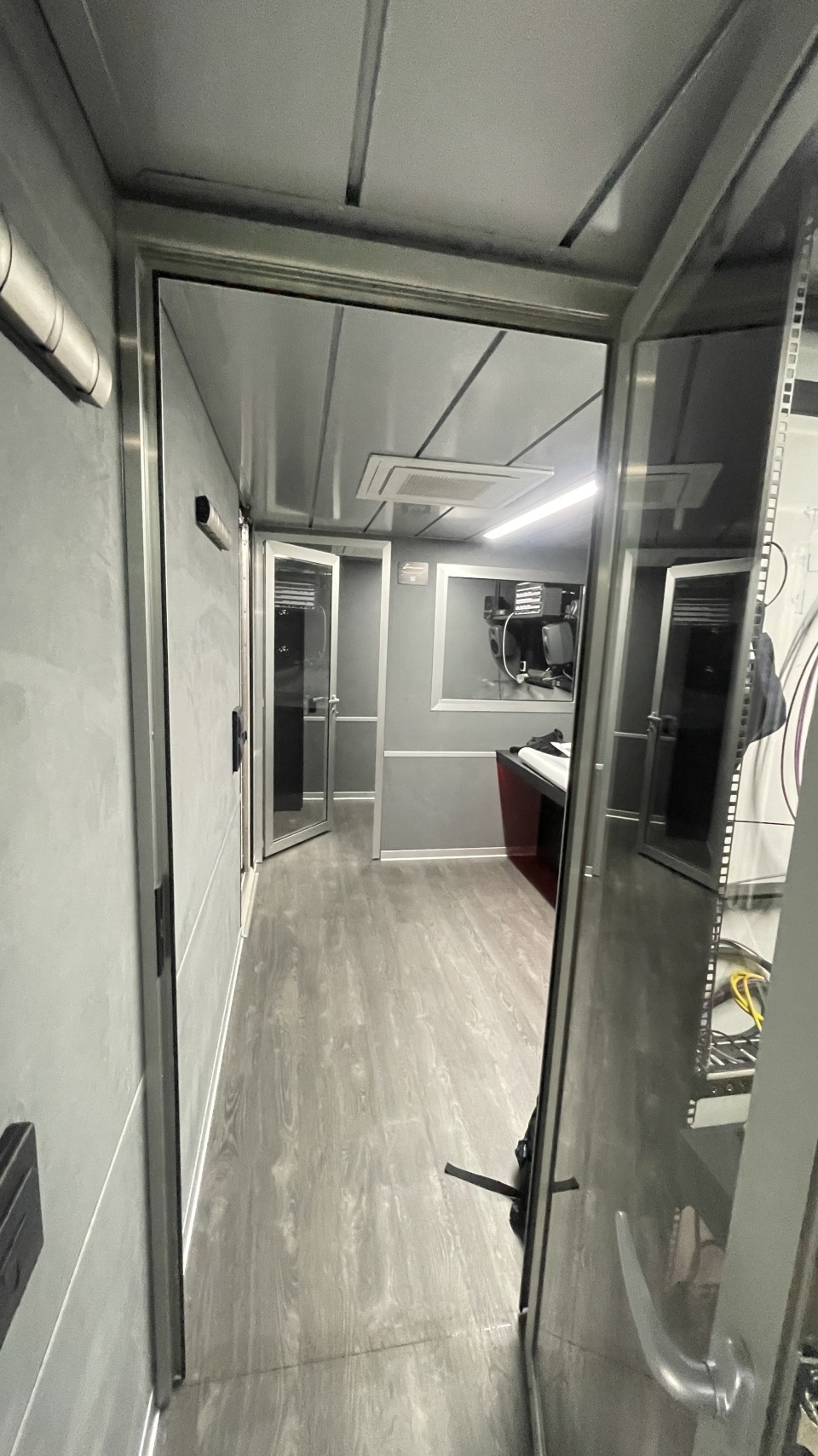 Vehicle with air-conditioned production, sound, and technical areas for up to nine operators
