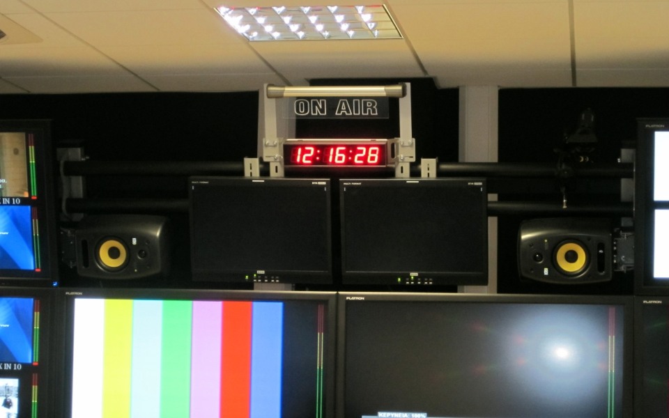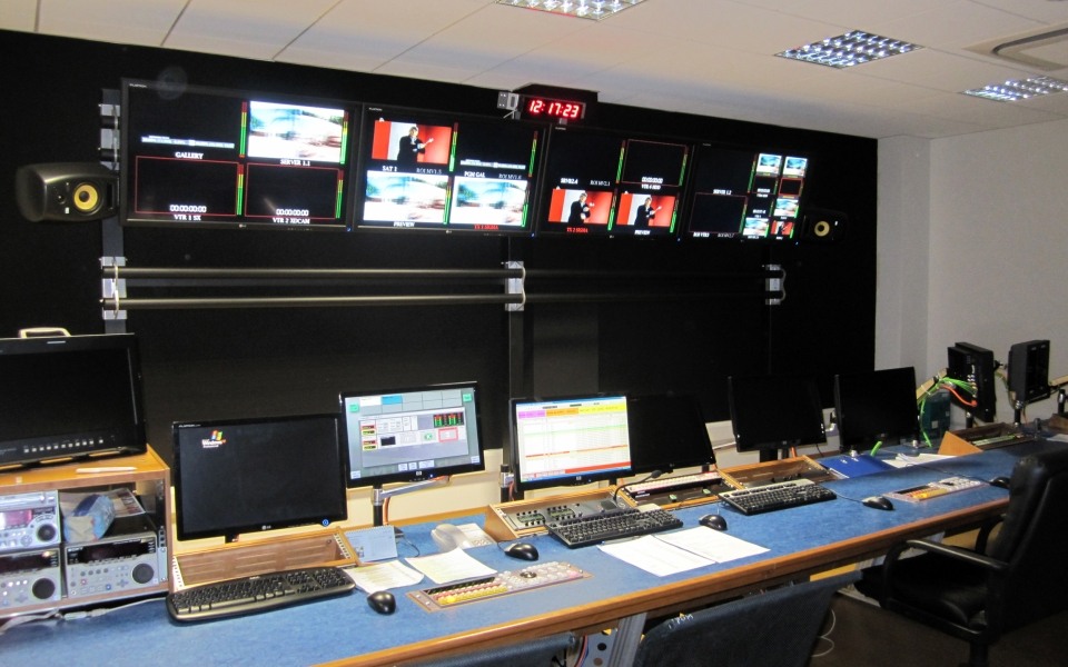 Central gallery supporting both studios with SD/HD vision mixer, news playout server, graphics, and external feed synchronizers.